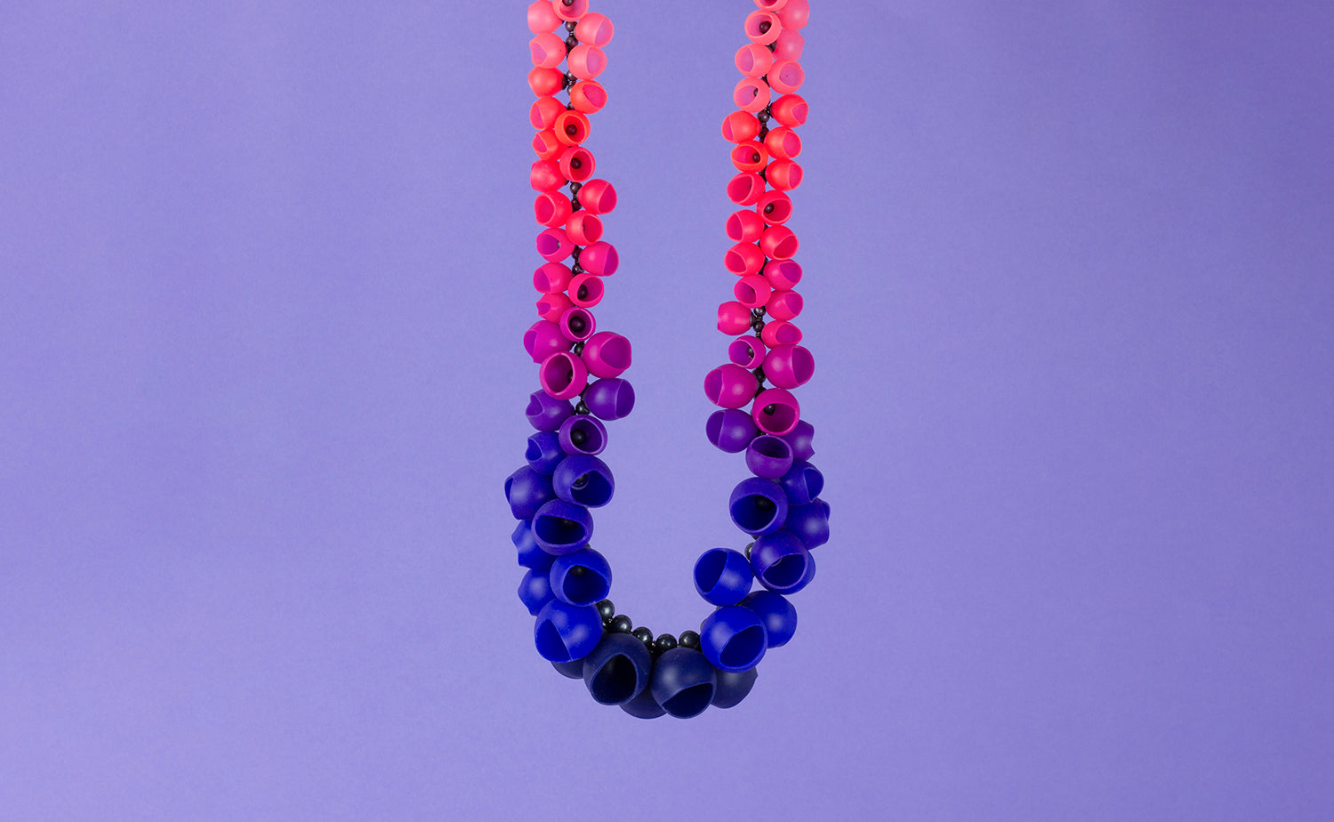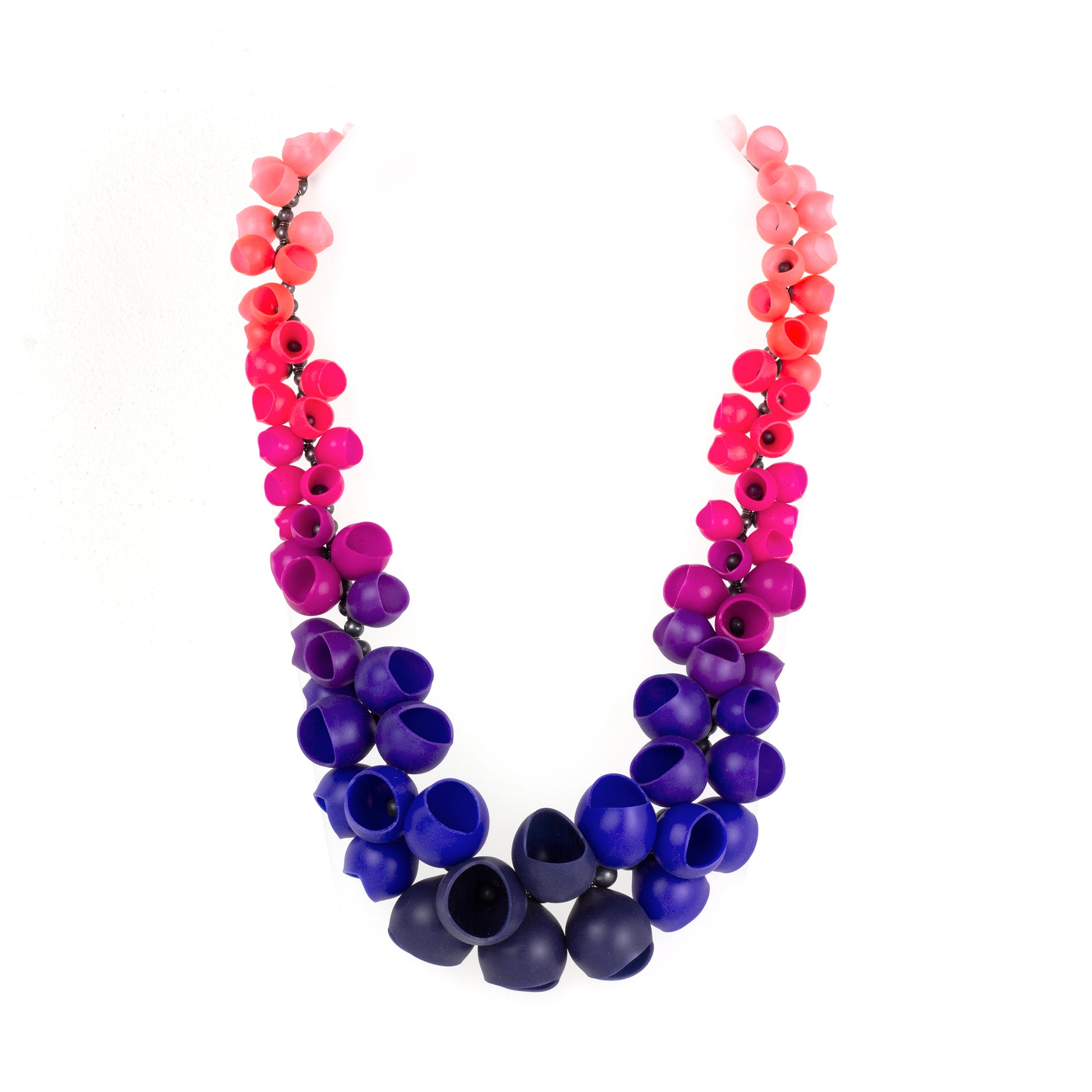 Stand out with this colourful statement necklace. Made from silicone and silver, each individual silicone form is hand-cast using the maker’s signature colour fade, graduating from navy blue, purple, through to pink and bright coral. Each silicone cup is threaded on to complimenting oxidised silver elements.