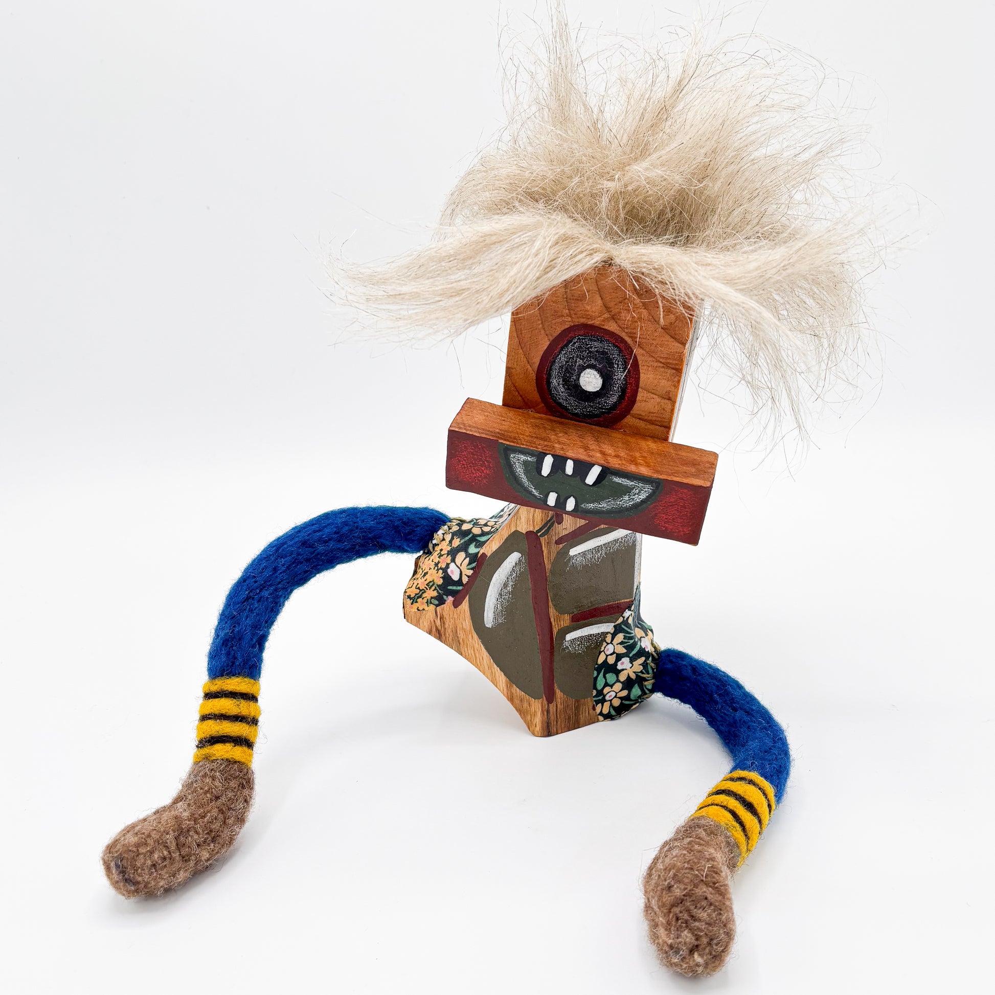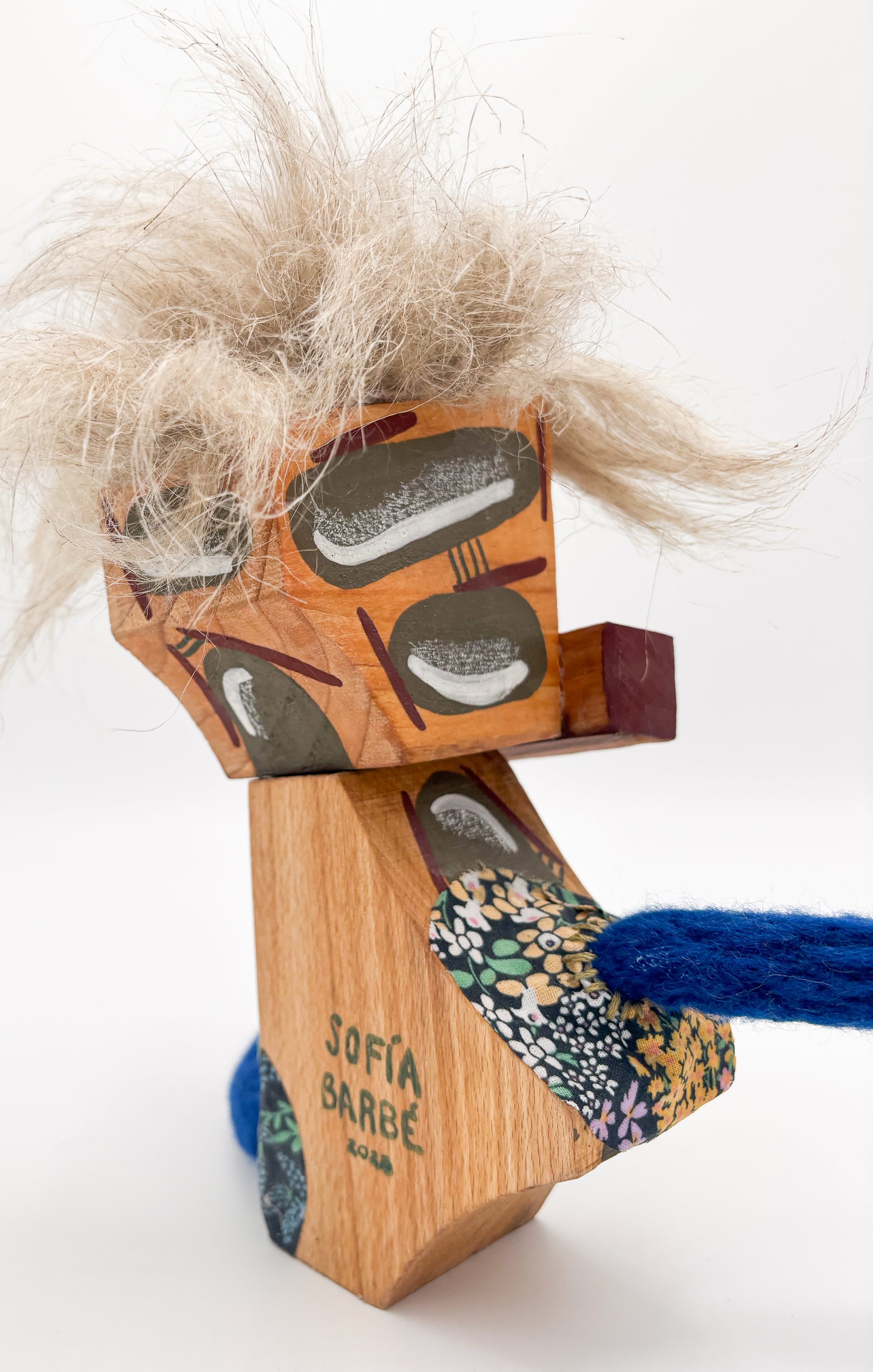 Wood, wool, flax, PVA, fabric, milk-based paint and pencils