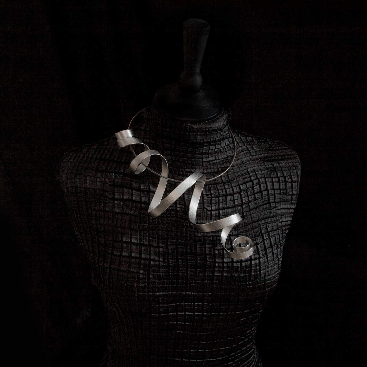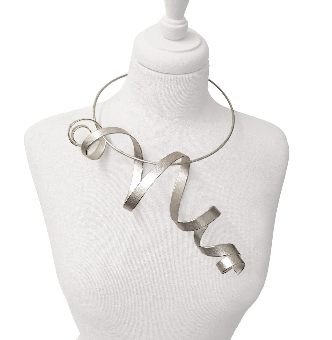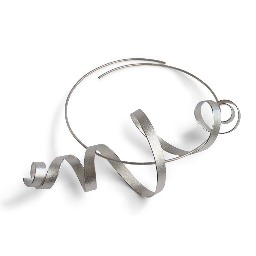 Sculptural pendant, initialled & hallmarked, recycled sterling silver, sand texture with burnished edges. Torque, recycled sterling silver. From the "Calligraphy" series, this dramatic pendant evokes a captivating sense of movement reminiscent of the flow of a calligrapher’s hand, captured in precious metal. Suspended from a minimalist torque, its dynamic curves and empty spaces create a striking wearable sculpture. Each piece is hand sculpted and unique within the limited edition series of 24, with sizes ranging from 10 - 30 cm in length. Available in recycled silver, bimetal, and to commission in Fairtrade Gold.