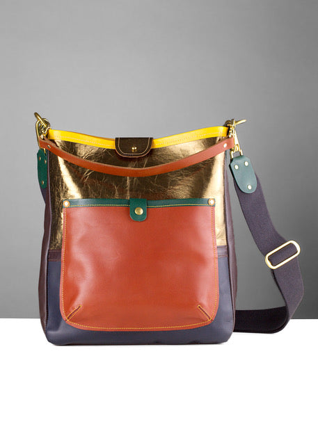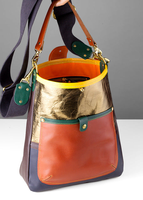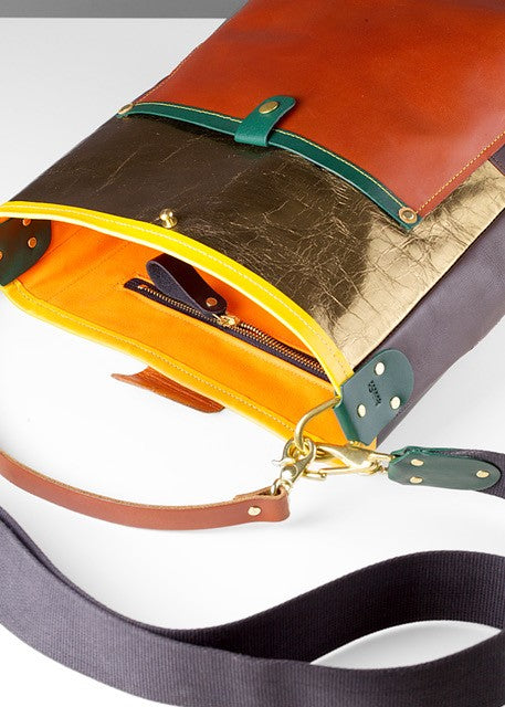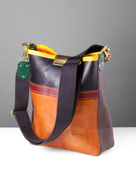 This composite vegetable tanned, Matisse-reference satchel is an exclusive piece, fusing art and function. The bag has an Equestrian-grade pure cotton English webbing adjustable shoulder strap and leather handle, with all brass hardware