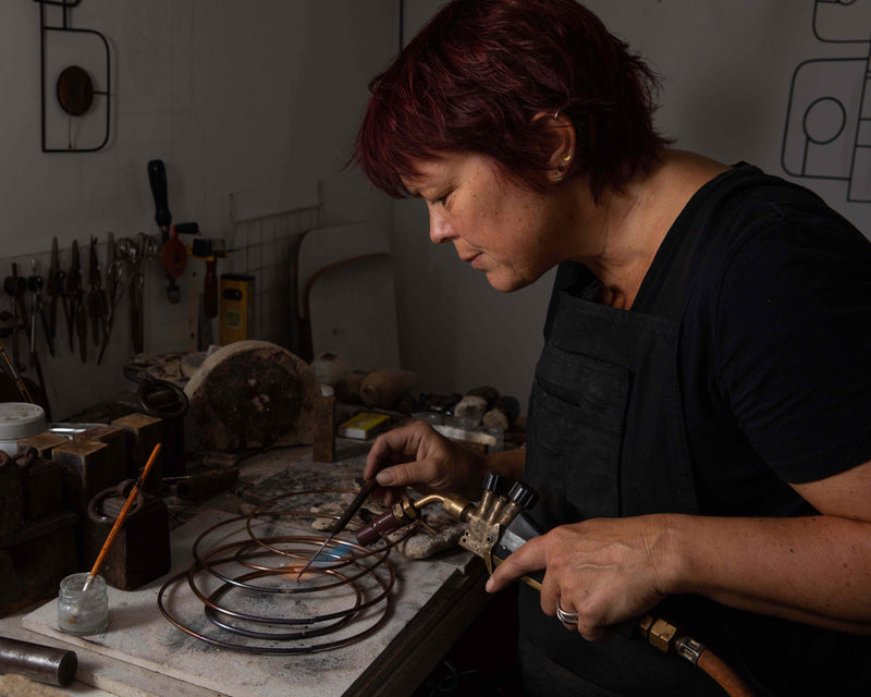 Jacky Oliver creates sculptural metalwork that explores line, composition, and space, where structure, delicacy, and the play of shadow are key elements of her pieces. Her work reflects the precision and refinement developed during her studies at the Royal College of Art.