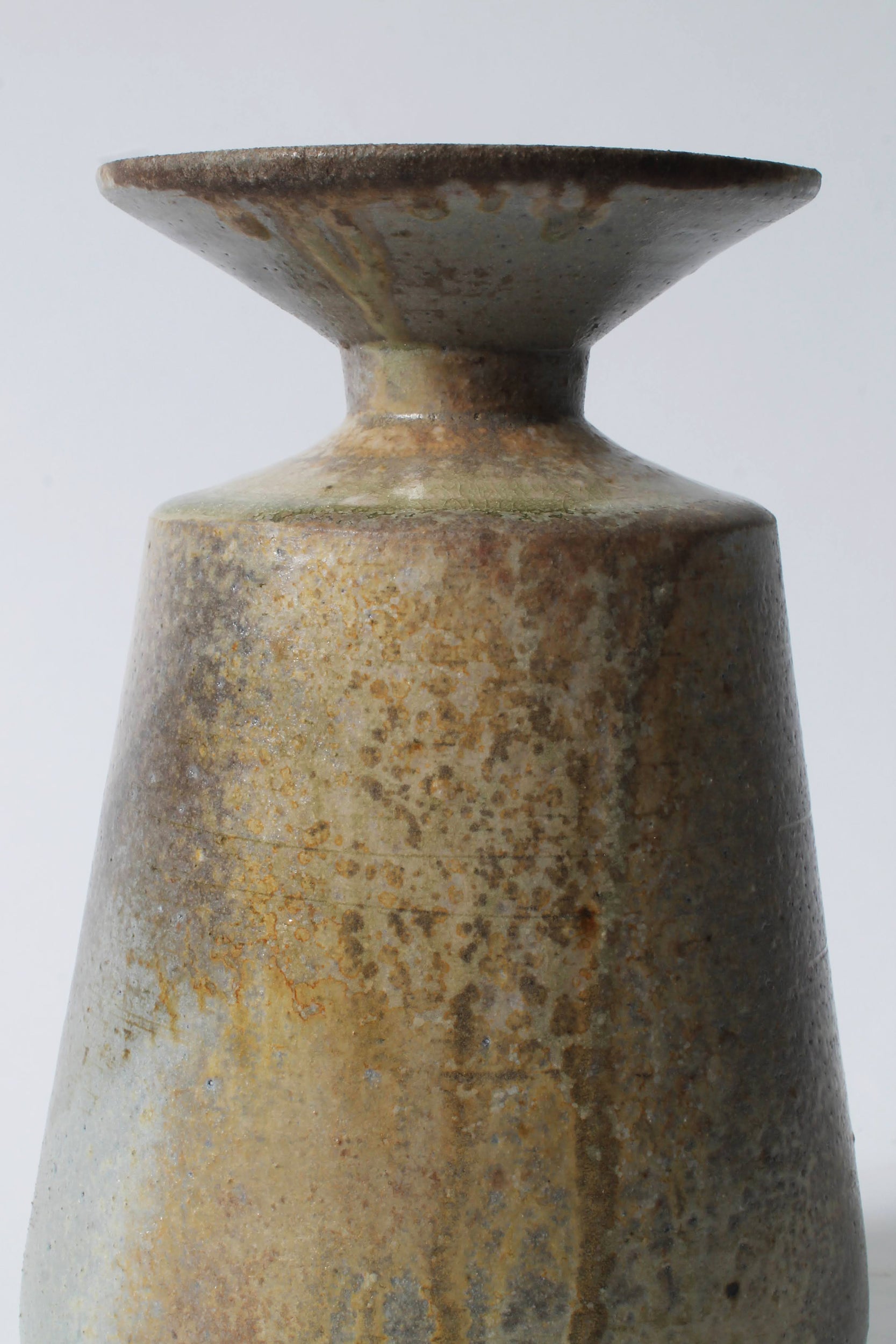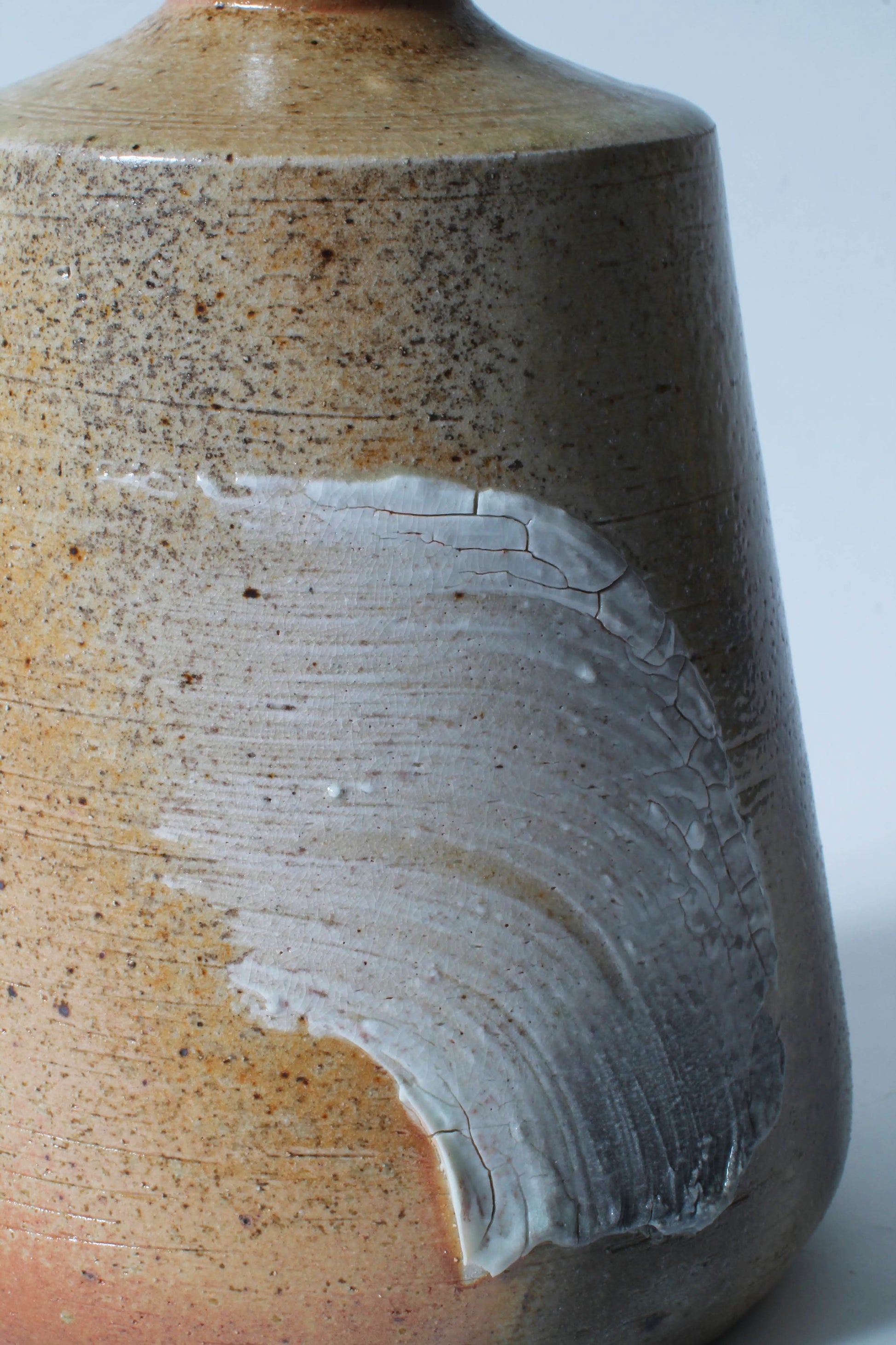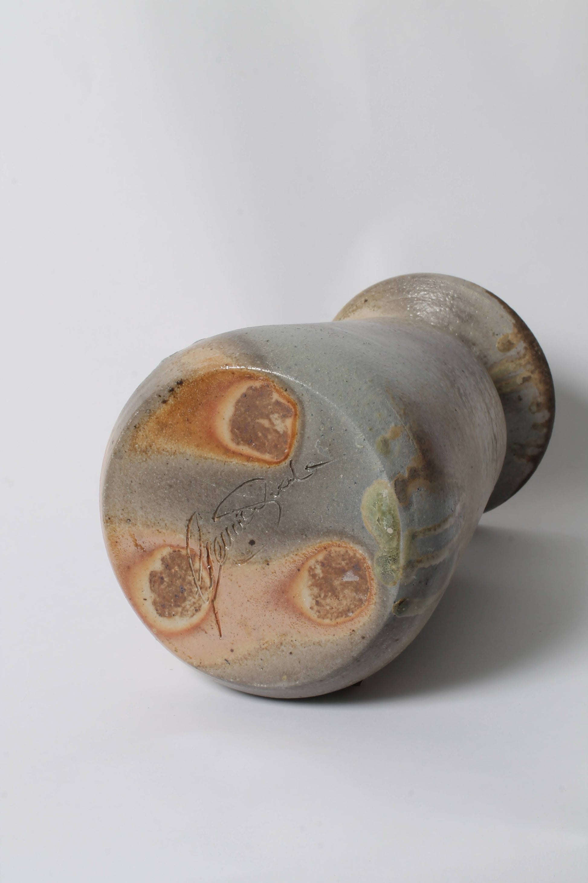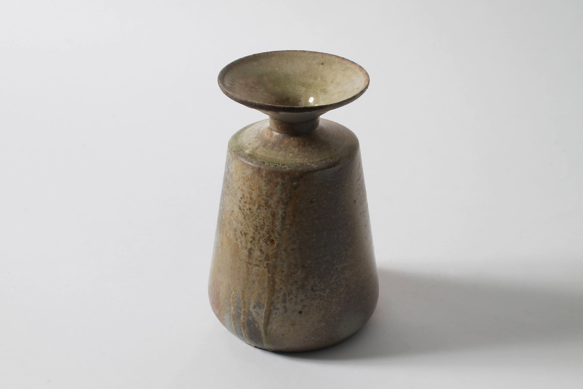 This piece was fired over three days in a traditional wood-firing kiln. Entering the kiln completely unglazed, the ash deposits from the fuel melted to create a dappled green, glassy surface with hints of grey and orange. On the underside, the direction of the flame path that passed beneath the piece during firing is visible, leaving a permanent scorch mark that tells the story of the firing process. Low-iron stoneware body with a small amount of porcelain slip applied.