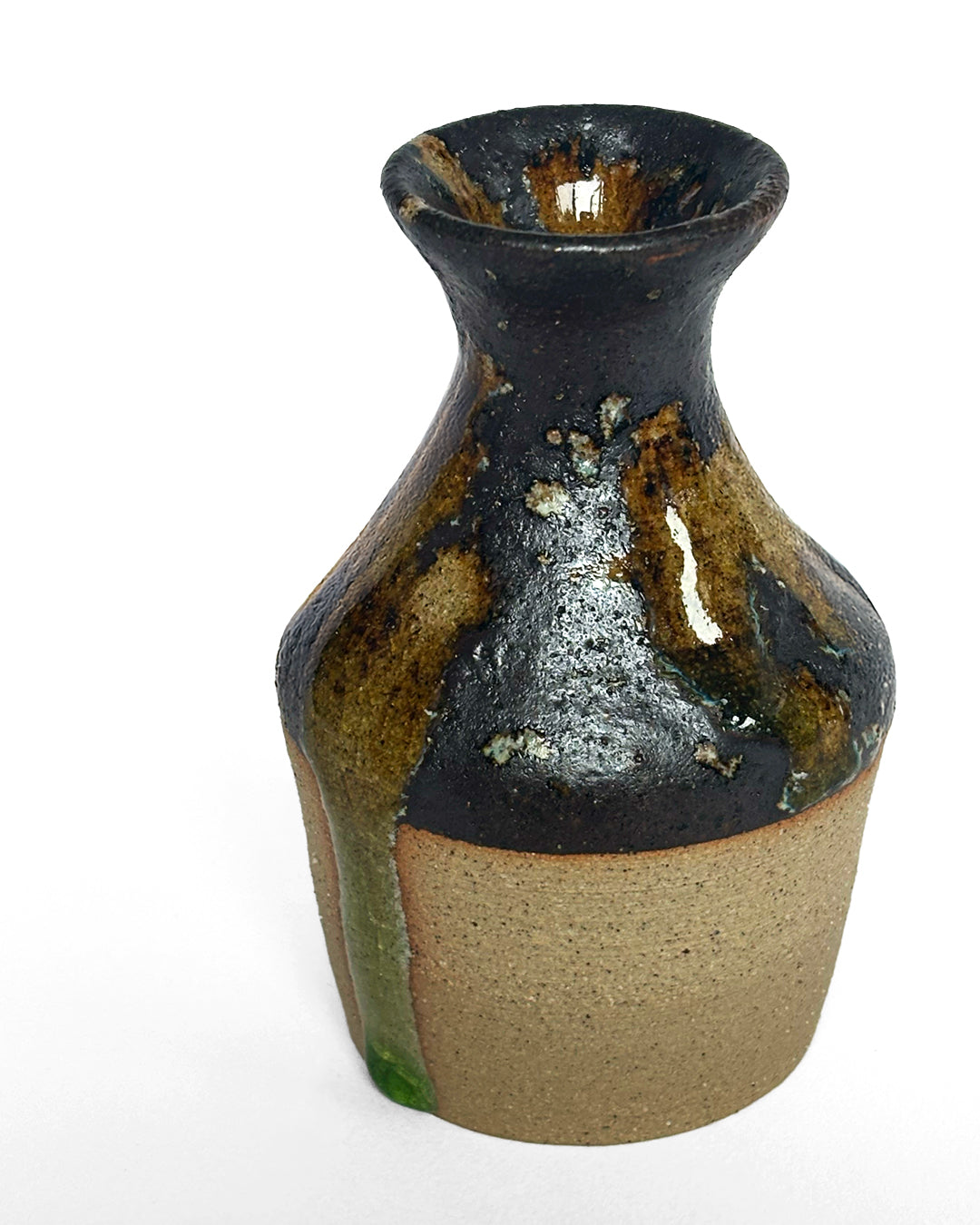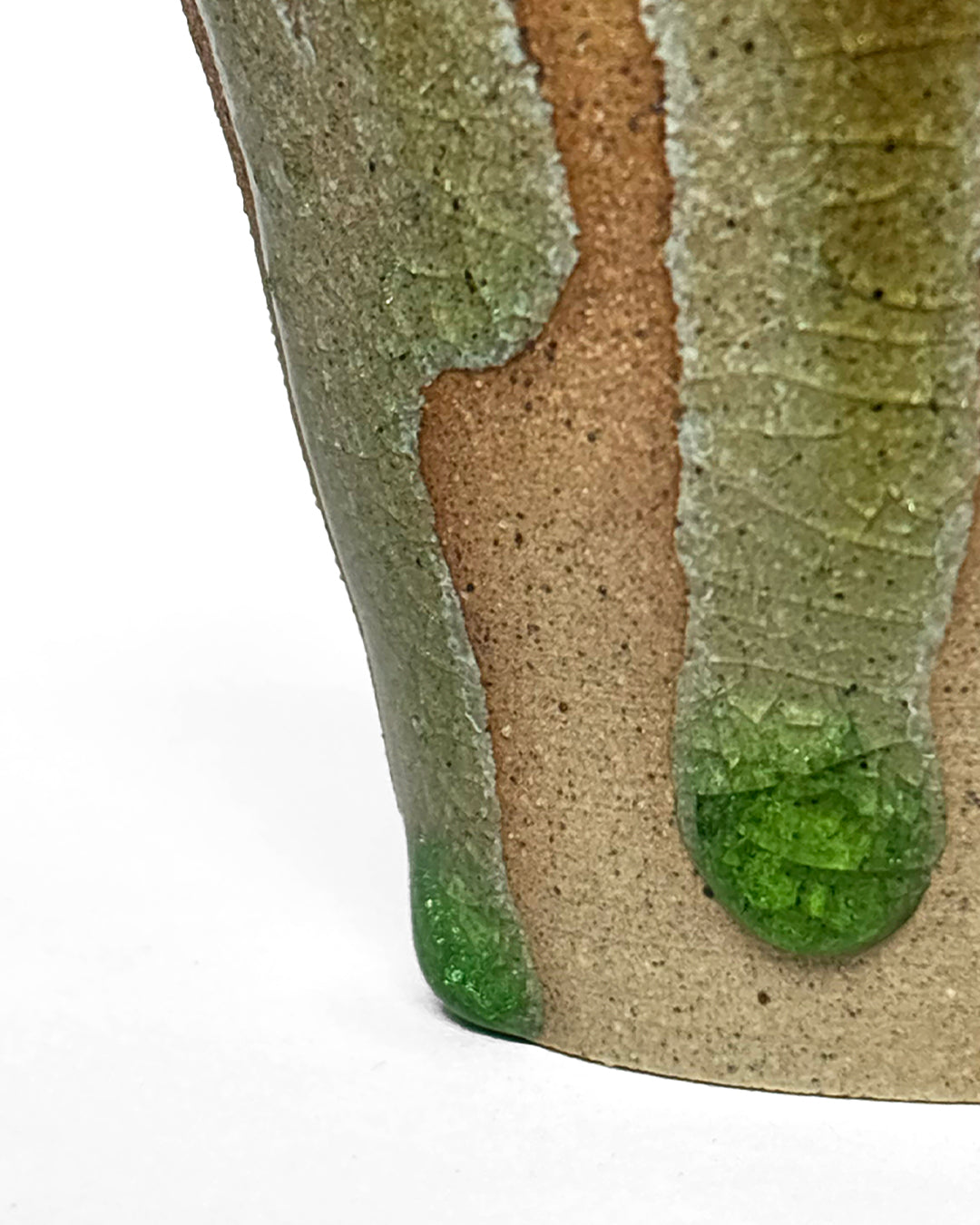 This set of pots have been made using clay sourced from a construction site. In the UK, it is estimated that thousands of tonnes of clay dug up during construction projects is sent to landfill. These pots have been created using this so-called waste material. The glaze is also composed of waste materials, including fireplace ash, construction site clay, and glass shards, all collected during the ceramicist, Neve Beill’s travels.