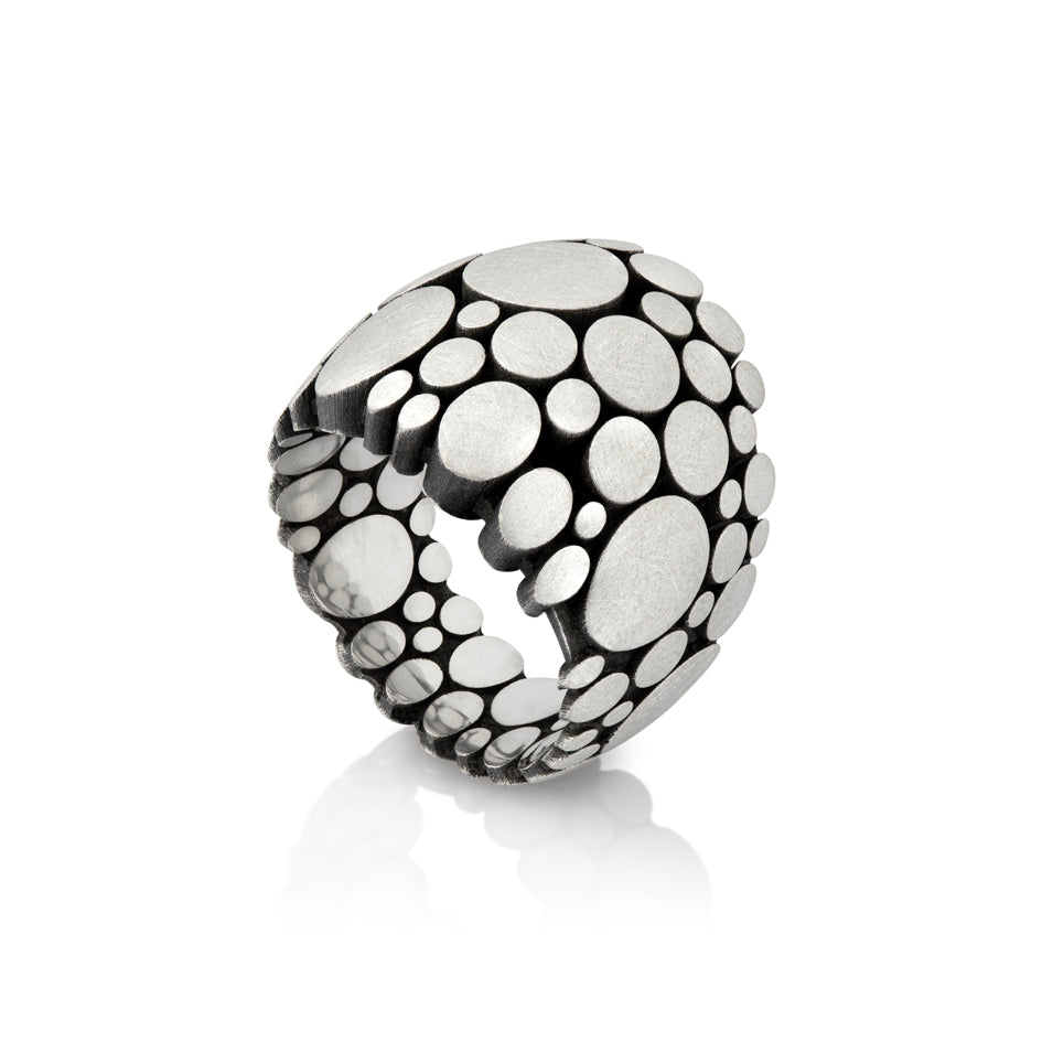 Sarah’s intention is to create intelligent designs that bring aesthetic pleasure, as jewellery, and as objects in their own right. She draws inspiration from the urban environment, adding her own organic interpretation. Engineering and problem solving play their part in her designs and her solutions are as much part of each piece as the design itself.