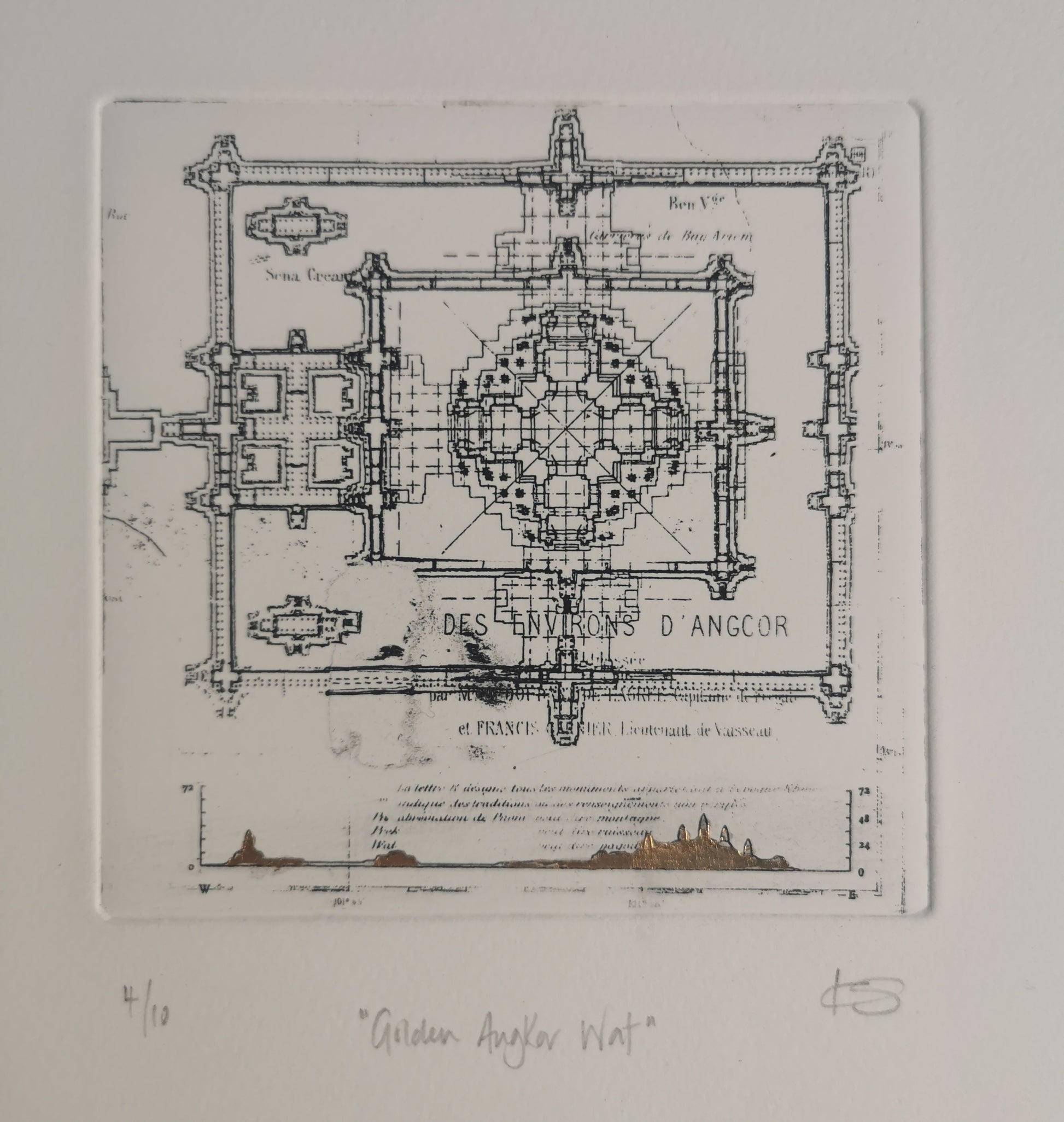Etching with 23ct gold leaf detail. The etching plate is inspired by drawings and collages made during visits to the beautiful Angkor Wat temple complex in Cambodia in 2000.