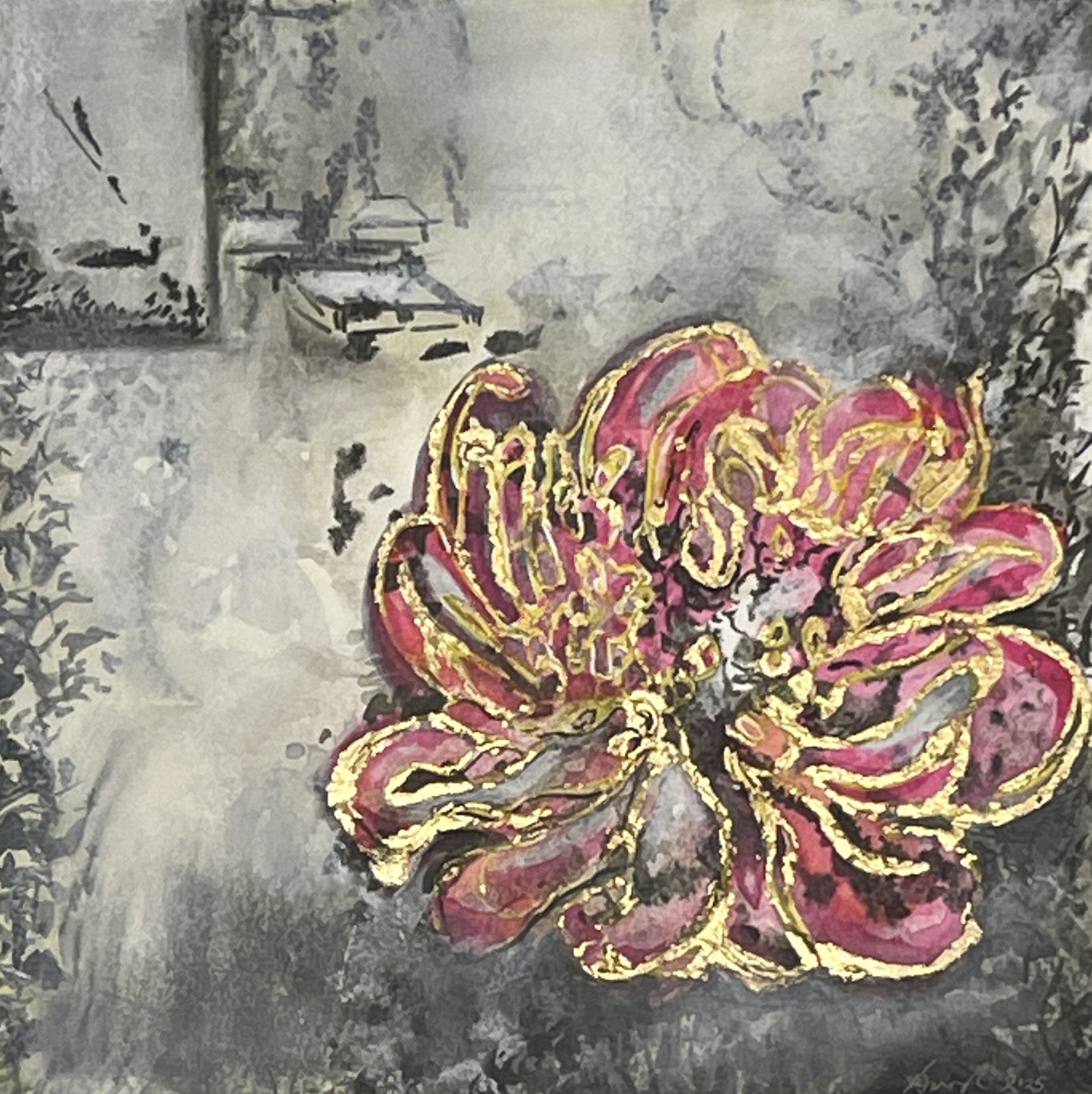 A preliminary ink and watercolour artwork of a flower in a landscape. Some details have been outlined in gold leaf. Framed in an oak frame with museum glass.