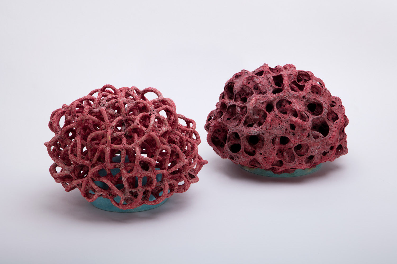Frothy red glaze surrounds the sculptural form, creating both harmony and tension. The artist visited the Museum of Mineralogy in Paris and was inspired by crystalline structures as well as the Clathrus ruber fungus. The pieces explore the overlooked details of micro-organic forms, presenting ideas around harmony and discourse, where fleeting cloud formations are fixed to represent the transient nature of life.