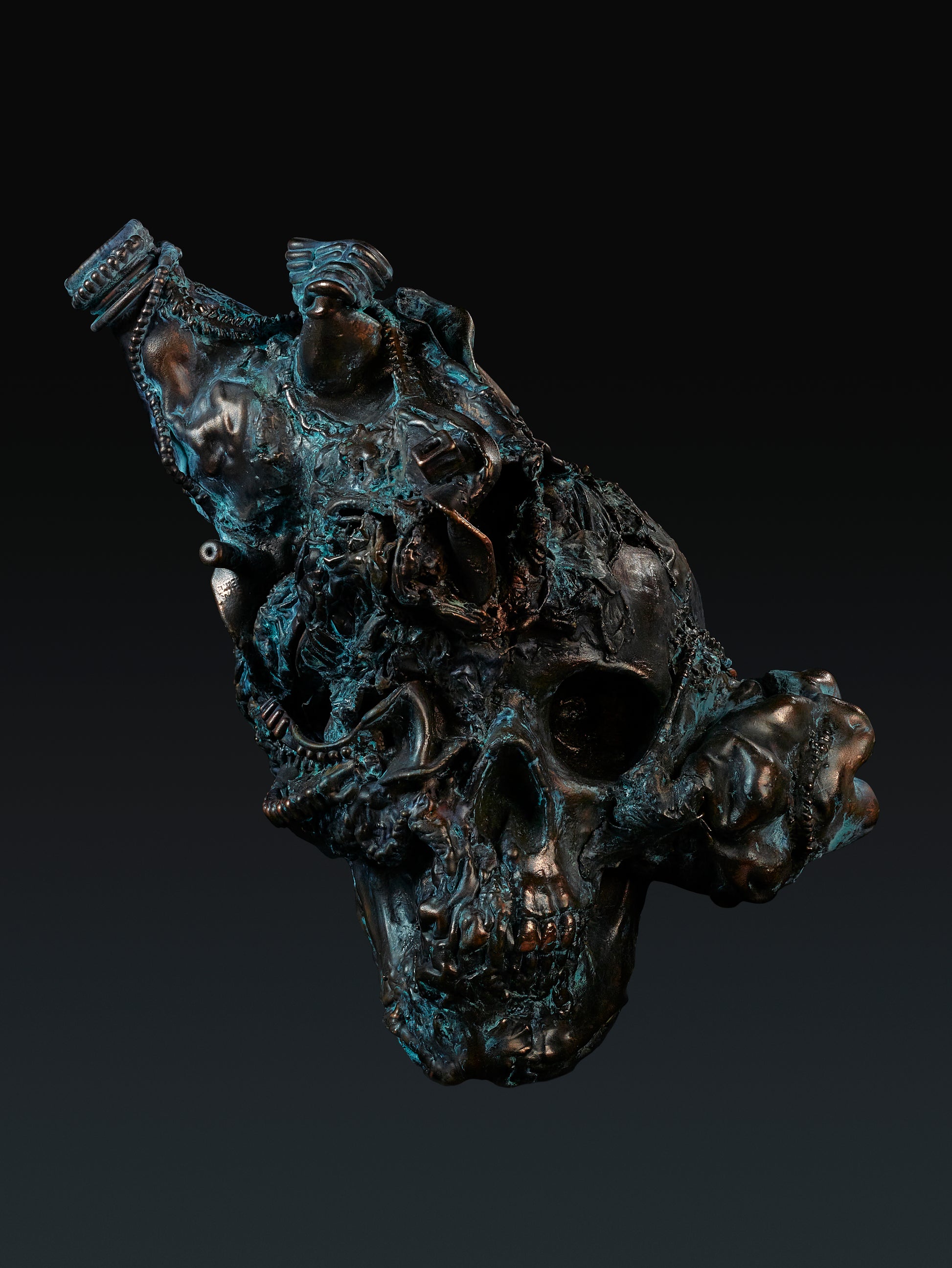 Electroformed copper skull sculpture, various plastics, dried organic materials, marble dust, resin, patina, acrylic paint, metallic pigments, costume jewellery elements, smoky quartz