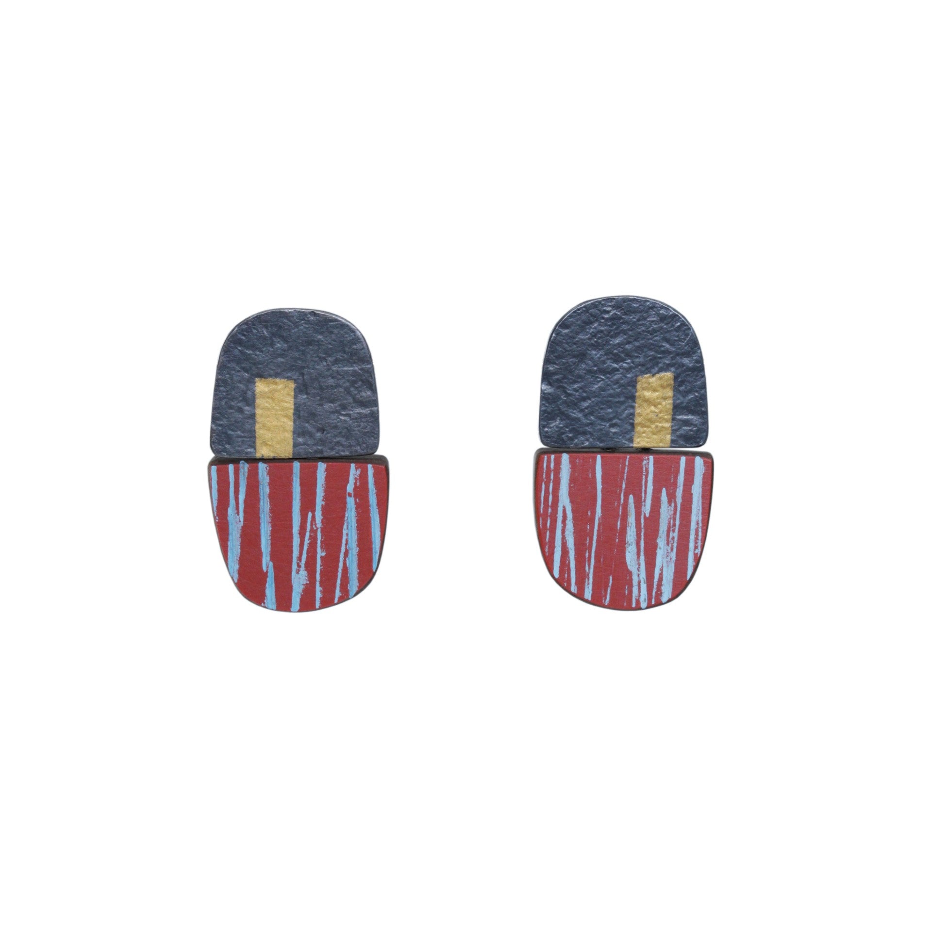 Subtly textured oxidised sterling silver shapes are mirrored by colourful laminate forms with a handcrafted linear sgraffito surface finish. The recessed lines are painted and sanded back to reveal the laminate. The oxidised sterling silver features a single keum-boo (24ct fused gold) line.
