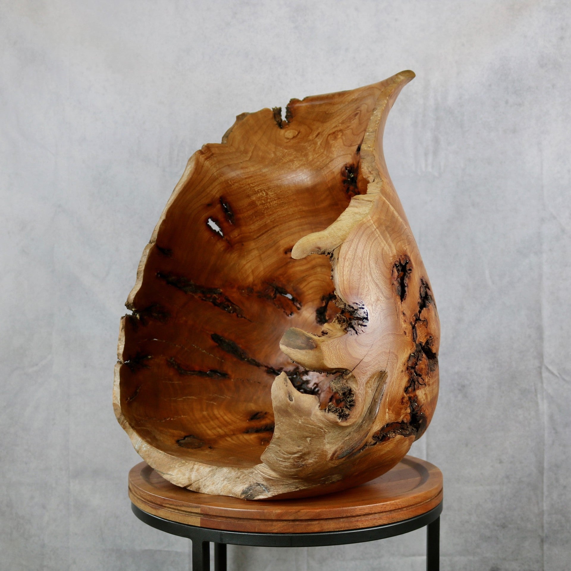 This sculpture is made from a large elm burl. It was made by mounting the wood to a traditional wood lathe and turning it off-centre. The natural edge of the burl gives the vase the look that something is missing or broken away, giving the sculpture the look of an Ancient Roman jug that has just been excavated.